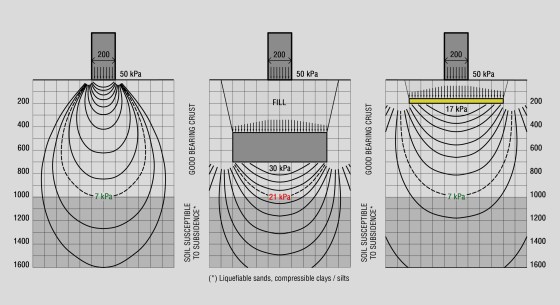 The use concrete pads may reduce the performance of the building especially when liquefiable or compressible layers are surcharged and punching failure mechanisms may be triggered.